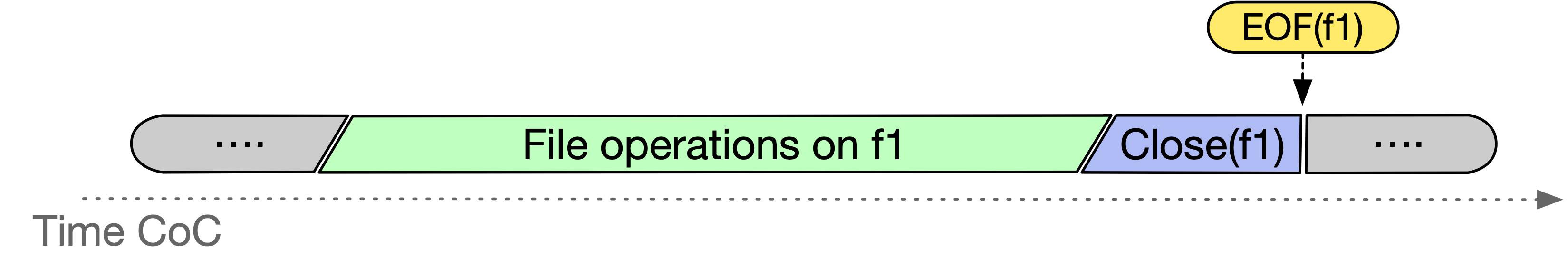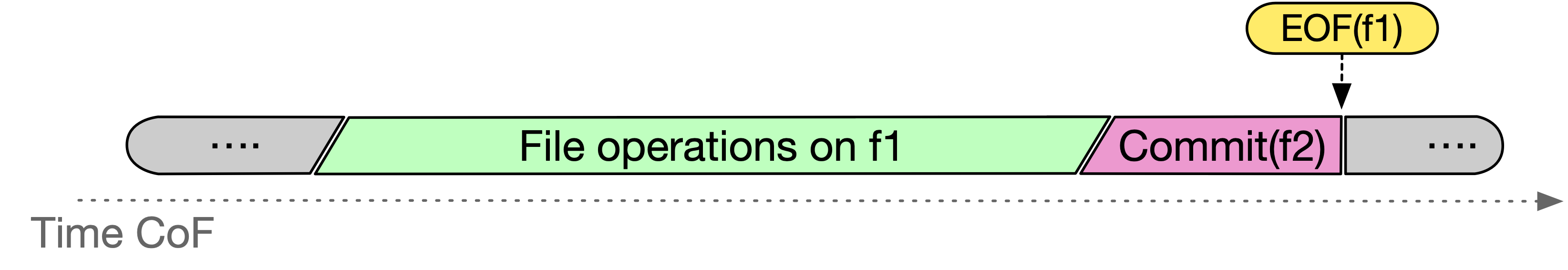 - Commit on File (CoF): We can consider a file committed when another file has been committed. This proves beneficial when the number of open() and close() system calls operations for a given file is not statically known. Instead, we are aware that the I/O operations can be considered concluded on a given file if another file has been committed. This additional commit behavior introduces a dependency among files in the commit rule, expanding opportunities to leverage temporal parallelism for I/O operations across different workflow steps.The following Gant diagram visually explains the CoF semantics: