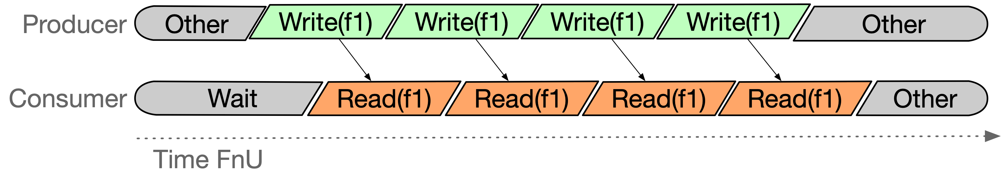 - Fire no update (FnU): file records already written by producer modules, can be consumed immediately: the file content is ready to be read as soon as data is written into the file. It is identified in the CAPIO-CL coordination language file with the keyword mode and value no_update. The following Gant diagram visually explains the CoC semantics: