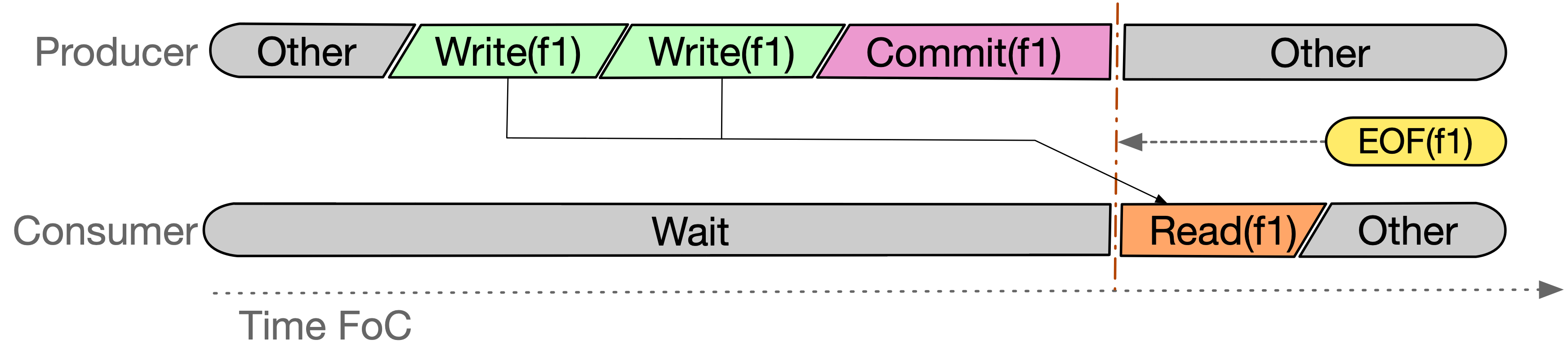 - Fire on-commit (FoC): whenever the commit rule is satisfied for a given file, the file is unequivocally ready to be consumed. In other words, the commit rule implies the firing rule for the entire file. This rule is identified in the CAPIO-CL coordination language file with the keyword mode and value update. The following Gant diagram visually explains the CoC semantics: